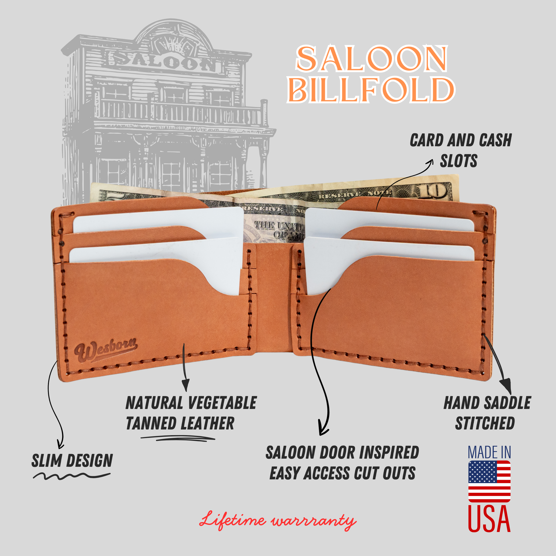 With pocket shapes that are Inspired by the curves of swinging saloon doors of the old west, I come up with a unique design that makes our billfold one of the slimmest on the market while still being durable, and crafted with purpose, It wears like iron and carries all your essentials comfortably!